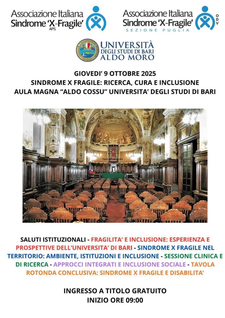 Giornata di approfondimento e confronto, organizzata dall’Associazione Puglia Sindrome X Fragile insieme con l’Associazione nazionale, dedicata alla Sindrome X Fragile. Un’occasione per fare il punto sui progressi scientifici, sulle prospettive terapeutiche e sull’importanza di costruire una società sempre più accogliente e consapevole.